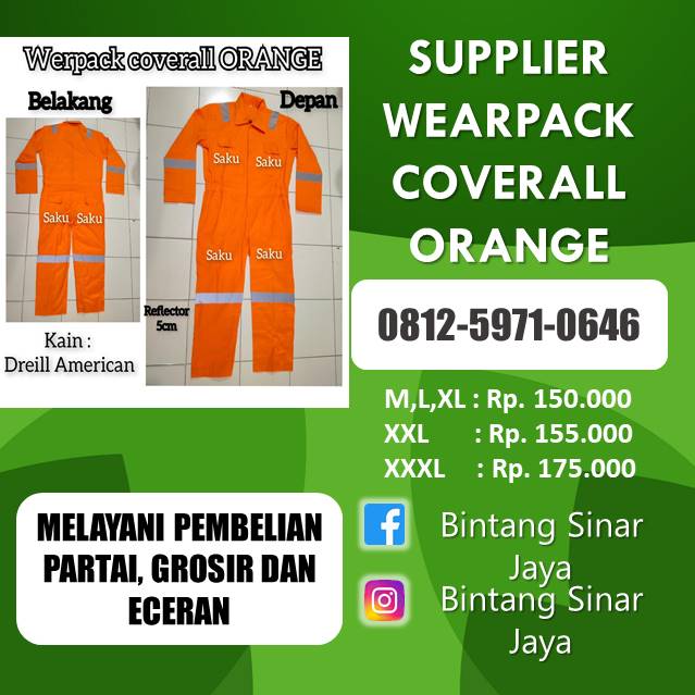 Overall/ Coverall/ Katelpak Stelan Kantor- Bahan eksklusive twill lembut dan nyaman dipakai, karakteristik nya menyerupai drill ya.. hanya bahannya lebih lembut tekstur nya.- Model baju wearpack simple cocok untuk kerja bengkel, kerja kantor dan seragam yang relevan dengan perbengkelan- Tersedia warna: orange, hijau tua, biru muda, biru tua, krem hitam kuning putih merah dll dengan size M L XL dan XXLDETAIL UKURAN:M : Pundak 47 cm, Lebar 54 cm, Lingkar dada 108 cmL : Pundak 49 cm, Lebar 56 cm, Lingkar dada 112 cmXL : Pundak 51 cm, Lebar 57 cm, Lingkar dada 114 cmXXL: Pundak 53 cm, Lebar 58 cm, Lingkar dada 116 cmINFO PEMESANAN :0822-2591-89020812-5971-0646Website : https://www.bsj-safety.com/Google Map : https://g.co/kgs/Qu3dMC#wearppackmurah #grosirwearpackmurah #jualwearpackmurah